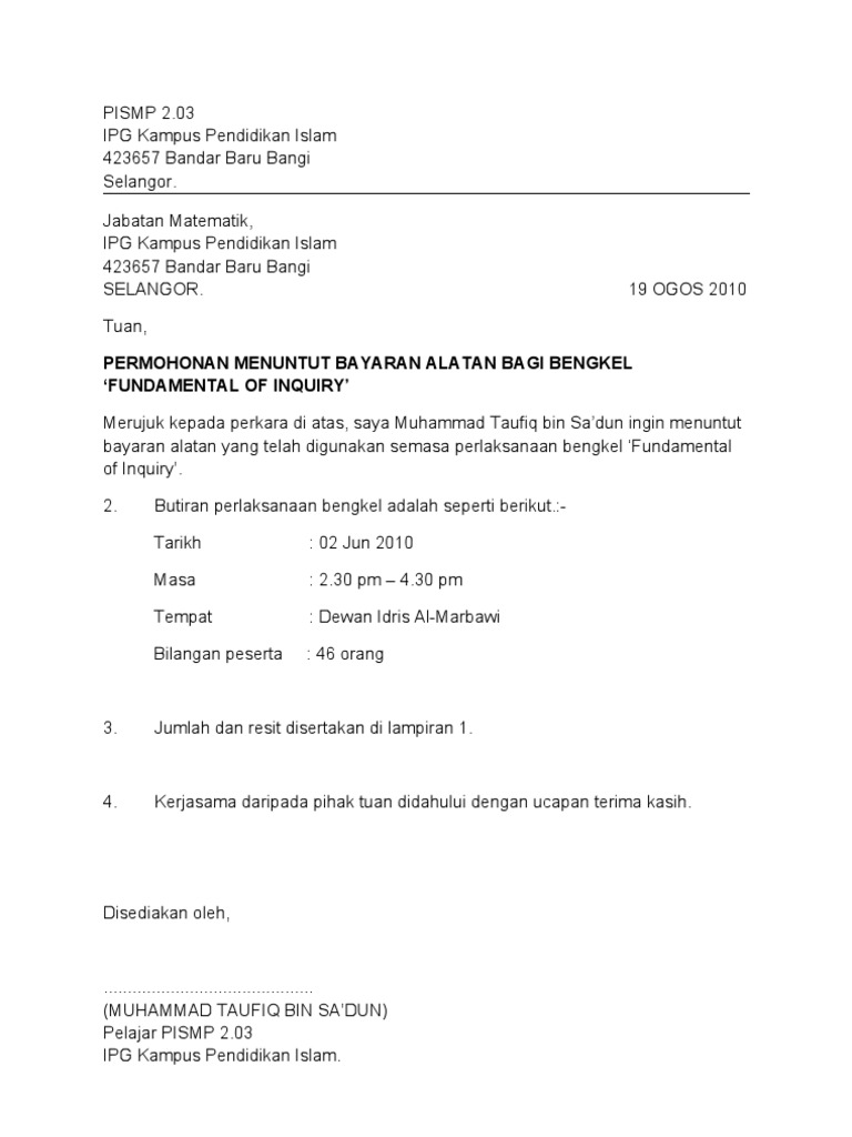 Contoh Surat Rasmi Rayuan Penangguhan Bayaran Yuran Semester Pdf